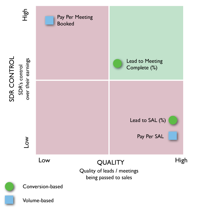 Measuring the percentage of leads that make it through to a pipeline opportunity, this approach prioritizes quality above all else. However, like Payment per Opportunity (SAL) it takes a lot of the control away from the SDR, by putting 100% of their earning potential into the hands of the AE, and their ability to progress leads to an opportunity.